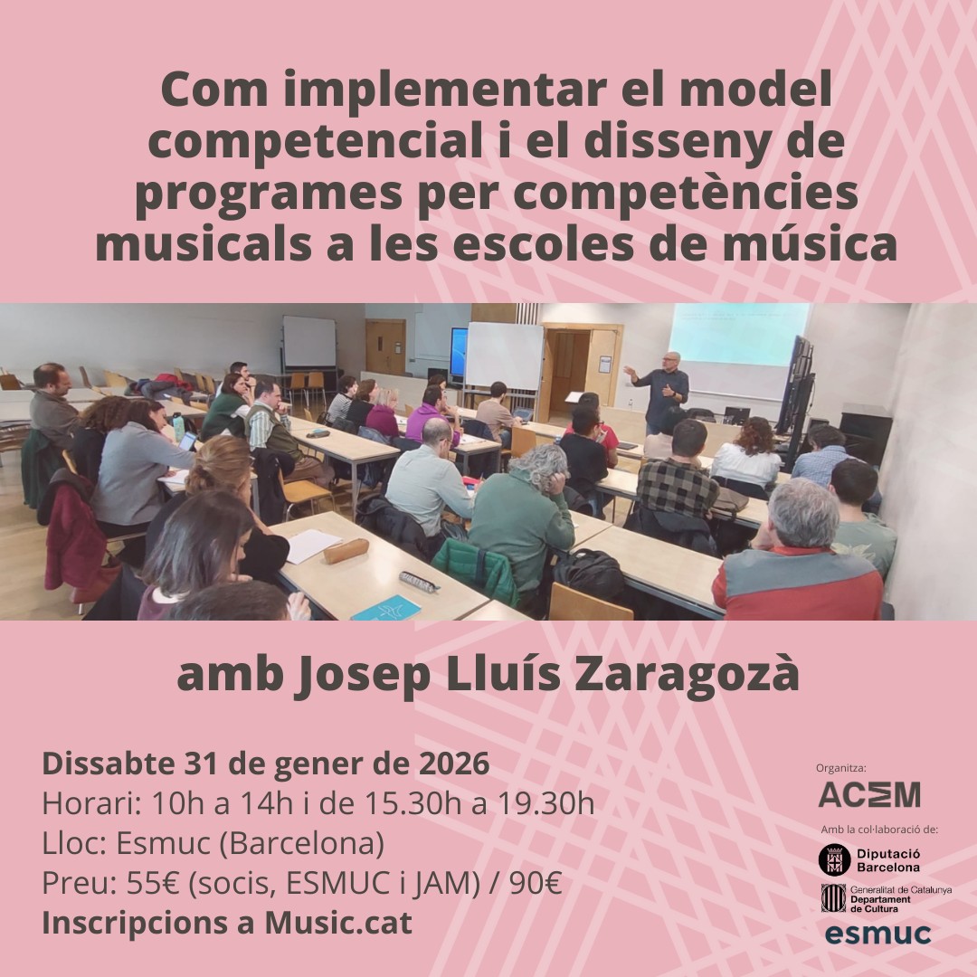 Formador: Josep Ll. Zaragozà MuñozData: 31 de gener de 2026Lloc: ESMUC, BarcelonaHorari: de 10:00 a 14:00 i de 15:30 a 19:30 (8 hores)Places: 30Preu: 55€ per professorat d’escoles ACEM i…